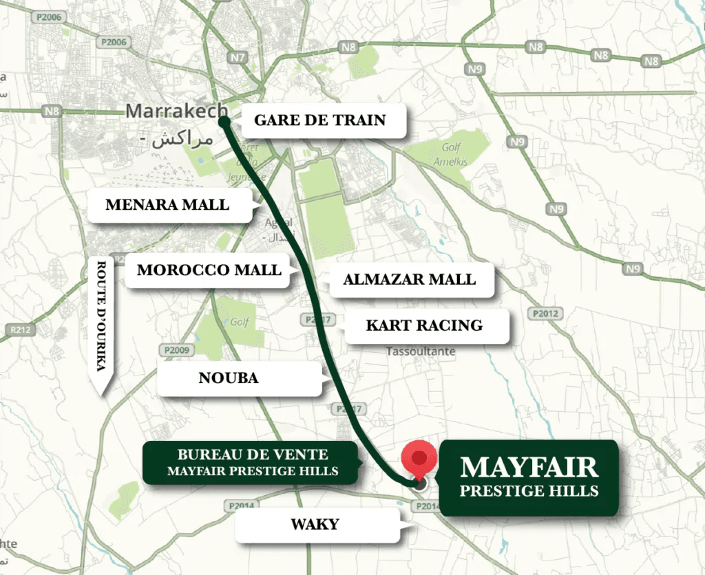 Bienvenue à Mayfair Prestige Hills, un projet de villas luxueuses idéalement situé sur la prestigieuse route de l’Ourika Km12 à Marrakech. Niché sur 21 hectares, ce domaine exclusif incarne l’harmonie parfaite entre modernité et tradition. Chaque villa est soigneusement conçue pour refléter l’élégance contemporaine et le charme authentique de la ville ocre.